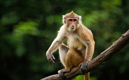 A cute small Macaque sitting on a tree branch in its natural hbaitat on a blurred background