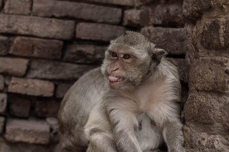Monkey sitting on the wooden fence in the garden, Thailand.