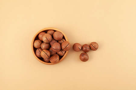 Macadamia nuts in bowl on beige background, top view. Macadamia is delicious nut with hardshell. Nutritious, tasty and healthy snack.