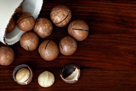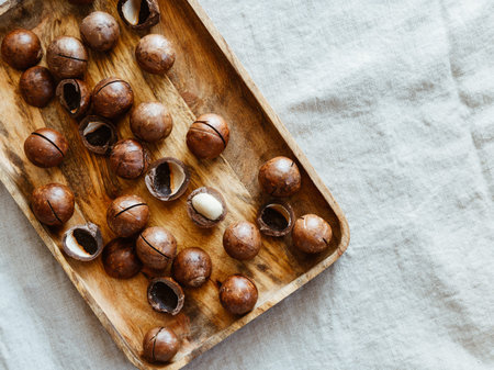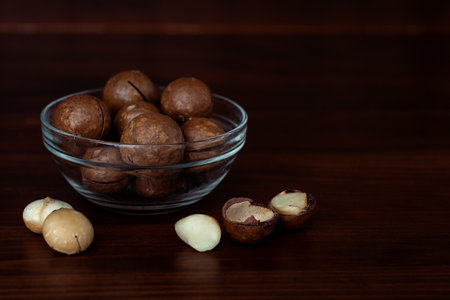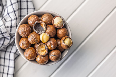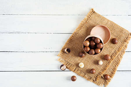 natural organic macadamia nuts in bowl on wooden table Flat lay Top view Healthy snack Nuts contain essential oil rich in vitamins B and PP, lot of fats and high in calories. Superfood.