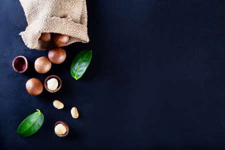 Shelled macadamia nut and peeled macadamia nut on a black textural background. The most expensive nut in the world, growing in Australia. top view and copy space