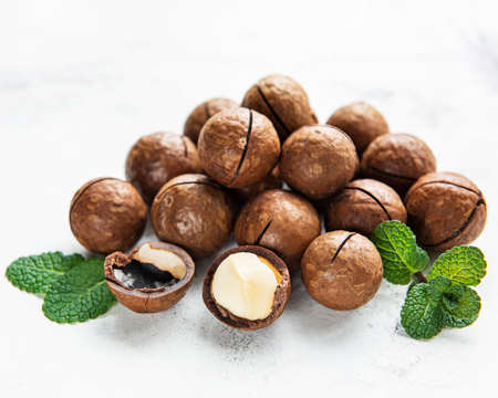 Organic Macadamia nuts on a marble background