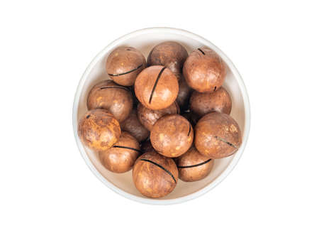 Macadamia nut in a ceramic bowl on a white background, top view