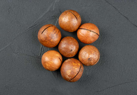 Several macadamia nuts on a dark concrete background, top view