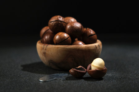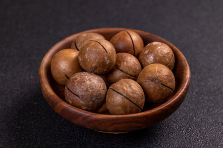 Delicious roasted macadamia nuts in shell on a dark textured concrete background. Vegetarian food