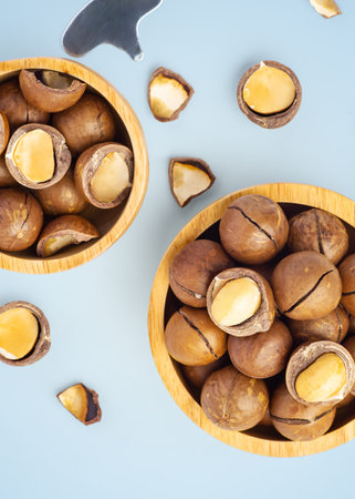 Macadamia nuts in shell in wood bowl with broken macadamia on blue background, top view