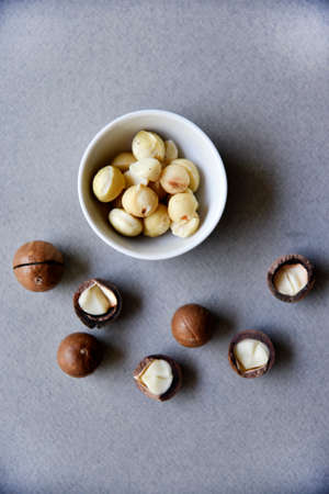 Delicious peeled Macadamia nut in a salad bowl on a gray background. The kernels of a delicious Macadamia nut close-up. healthy meals.