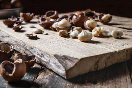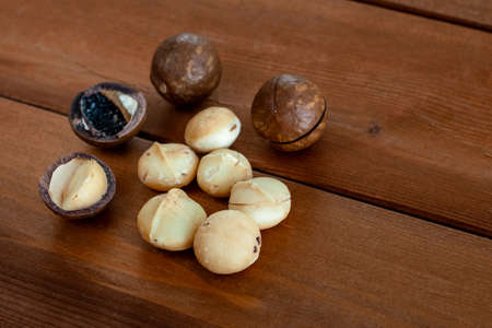 Macadamia nut on wooden table. Shelled and unshelled macadamia nuts. Superfood and healthy food concept