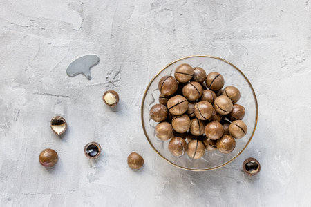 Organic Macadamia nuts on a gray concrete background