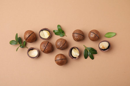 Tasty Macadamia nuts and green leaves on beige background, flat lay