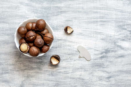 Organic ripe whole Macadamia nuts in bowl on old white wooden rustic table. Healthy vegan vegetarian food, vitamin.