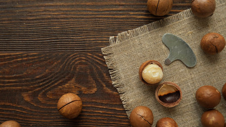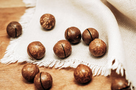 Macadamia nuts on a wooden table and linen towel