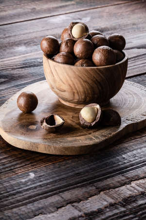 Organic ripe whole Macadamia nuts in bowl on old wooden rustic table with copyspace vertical. Healthy vegan vegetarian food, vitamin.