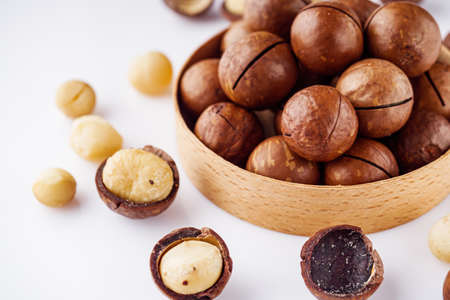 Whole nut and Macadamia kernel on a white background. Delicious whole nuts. natural background. healthy meals.