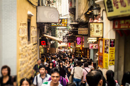 Macau, China - August 1, 2012: tourists and shoppers walking along a narrow street in central Macau with many shops and restaurants