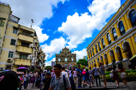 Macau (Macao SAR) / China - July 26, 2015: Tourist visit the Ruins of St. Paul catholic church built in 1640, best known landmark and UNESCO World Heritage Site in Macau, China