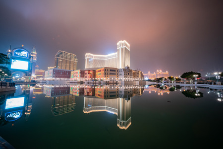 Macau, DEC 24: Night view of the famous Venetian Macao Casino with beautiful reflection on DEC 24, 2018 at Macau
