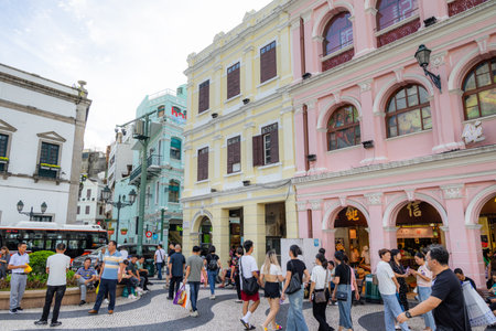 Macau, China - 3 September, 2011: Street scene with crowds of people in the colonial district of Macau during the daytime