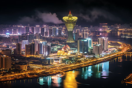 Night view of the Macau Tower and skyline of Macau, in Macau Special Administrative Region, China