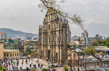 Ruin of St Paul, Macau - December 2019 : Too many people are coming to visit the Ruin of St Paul gate, which is the most famous landmark of Macau. Perspective view from the main shopping street.