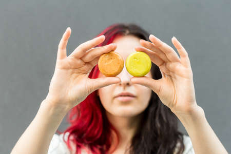 Colorful turquoise, pink, orange, purple cake French macaron or macaroon on concrete gray background