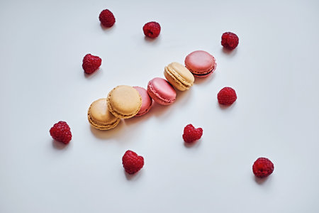 Pink and green macaroons on light white background. Traditional French sweet dessert.