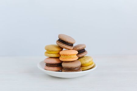 Tasty french macarons on a white plate. White wooden background, pastel colors. Place for text.