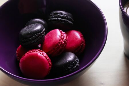 French dessert. Sweet pink macaroons or macarons with cranberry dark background. copy space