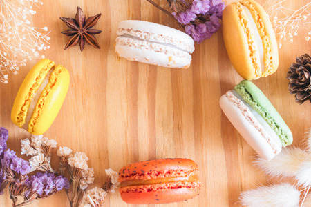 Beautiful and cute French or Italian macaron in top view flat lay. Homemade delicious pastel color macaron on wood table for background or wallpaper. French dessert with tea or coffee. Macarons frame.
