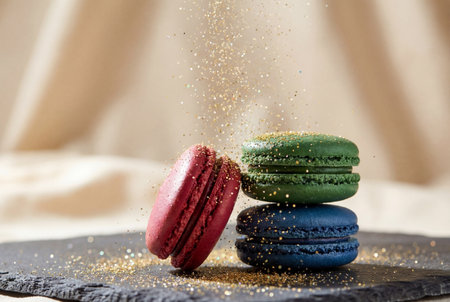 Close-up of two mini macarons blue and yellow stacked on top of each other. Perfect for use in dessert, confectionery and food-related designs