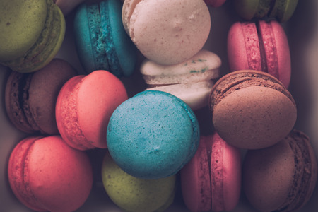 A lot of french colorful macarons on a woody floor in vintage tone style