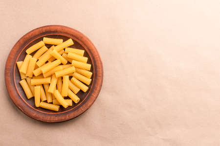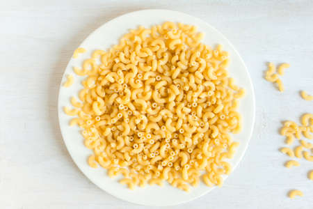 Uncook italian macaroni pasta raw food on white dish