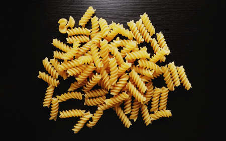 Uncooked Fusilli Pasta with Copy Space on Black Background. Raw and Dry Macaroni. Fat and Unhealthy Food - Flat Lay