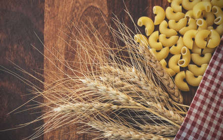 Vintage toned picture of the ears of wheat with pasta on the wooden background.