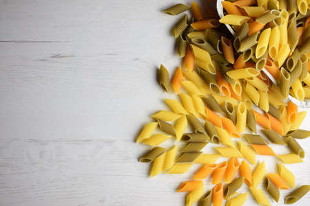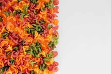 Multicolored pasta scattered on a white background. Top view. Copy, empty space for text.