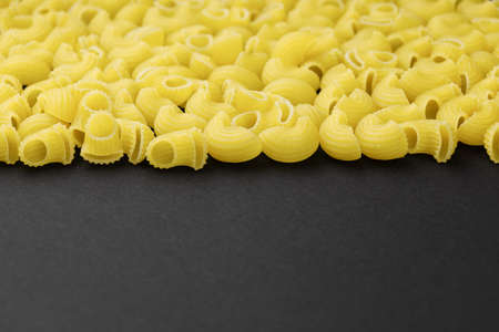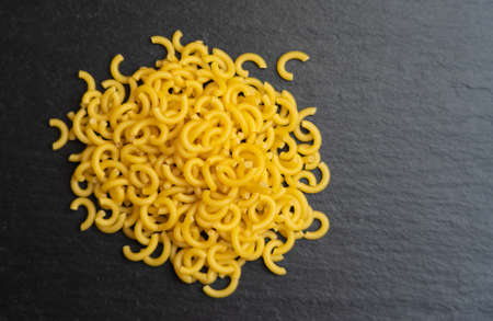 raw uncooked yellow macaroni on black table