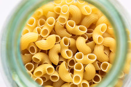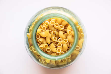 Horns pasta isolated on white background, top view, in glass jar. Food banner with place for text.