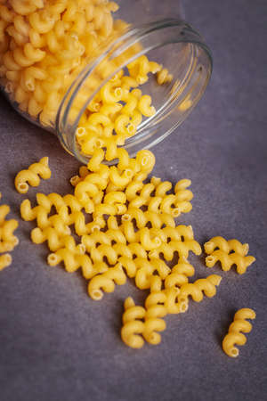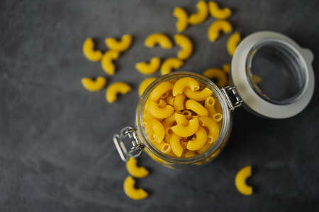 Top view of raw pasta inside the a glass jar on grey background