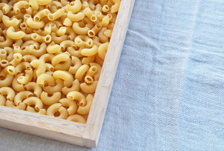 Food and Cuisine, Top View of Uncooked and Dried Elbow Macaroni Pasta in A Wooden Tray With Copy Space for Text Decoration.