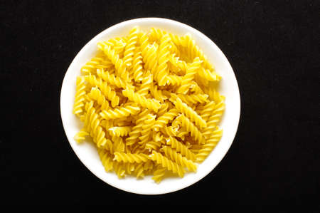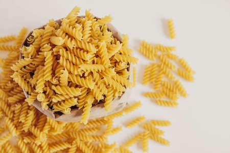 Raw italian fusilli pasta in the white bow top view