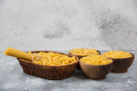 Pile of various uncooked dry pasta in wicker basket and wooden bowls
