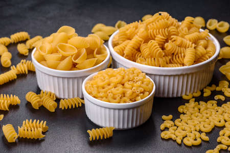 Border made of different kinds of raw pasta on dark background. View with copy space.