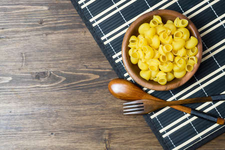 Uncooked pasta in wooden bowl. Preparation for cooking.