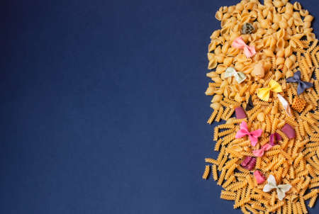 Colorful Italian pasta on blue background. Close up. Top view.