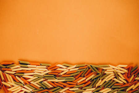 Frame made of colorful green, yellow and red penne pasta naturally coloured with tomato and spinach. Non-perishable products concept.