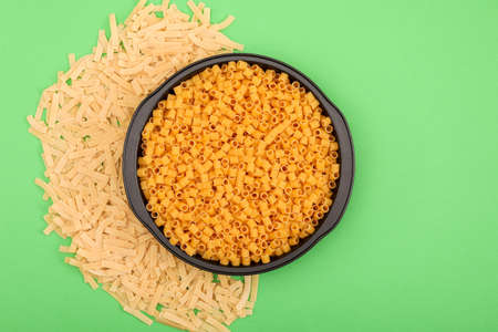 Small pasta on black background with copy space, top view