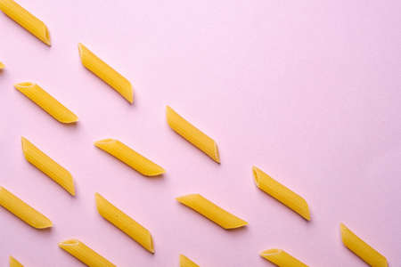 Italian pasta, raw penne tube macaroni pattern on pink background, top view copy space, abstract food