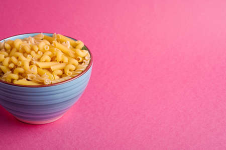 Blue bowl with variety of uncooked golden wheat pasta on minimal pink background, angle view copy space