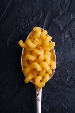 Cutlery spoon with cavatappi uncooked golden wheat curly pasta on dark black textured background, top view