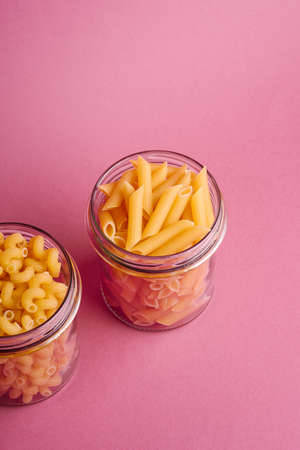 Two glass jars with variety of uncooked golden wheat pasta on minimal pink background, angle view copy space